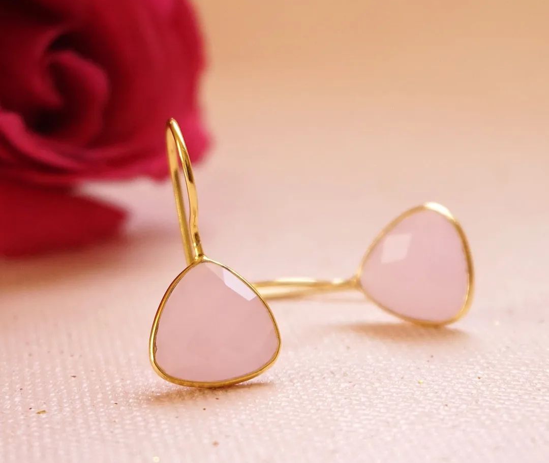 Pink Chalcedony Trillion Shape Gemstone 925 Sterling Silver Dangle Earrings